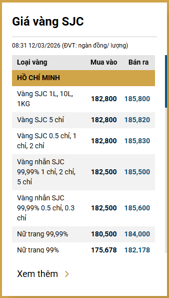 Tại Việt Nam, sáng 12/3, giá vàng SJC được Công ty Vàng bạc đá quý Sài Gòn niêm yết ở mức 182,8 - 185,8 triệu đồng/lượng (mua vào - bán ra).