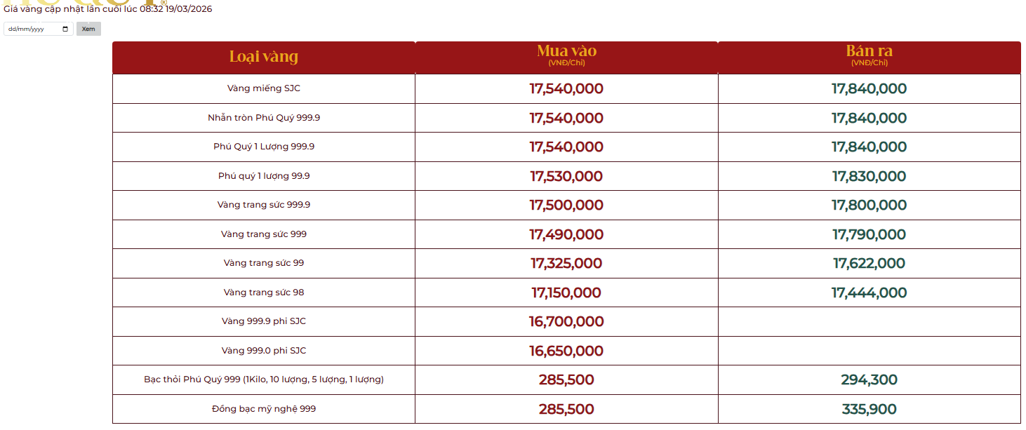 Giá vàng tại Công ty CP Đầu tư vàng Phú Quý: