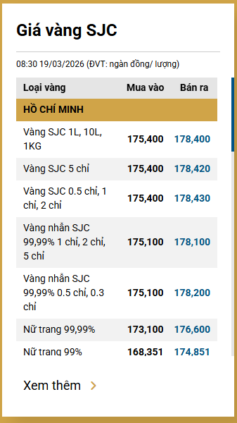 Tại Việt Nam, sáng 19/3, giá vàng SJC được Công ty Vàng bạc đá quý Sài Gòn niêm yết ở mức 175,4 - 178,4 triệu đồng/lượng (mua vào - bán ra).