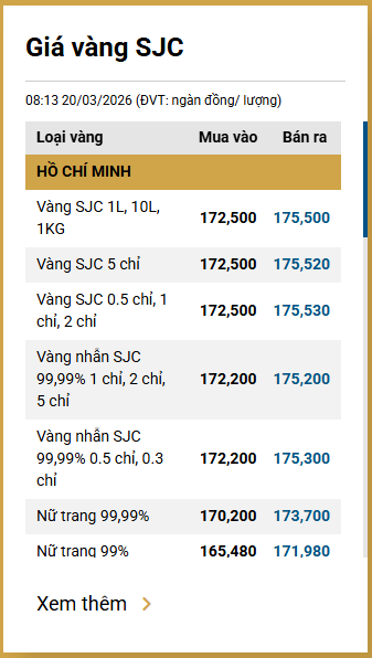 Tại Việt Nam, sáng 20/3, giá vàng SJC được Công ty Vàng bạc đá quý Sài Gòn niêm yết ở mức 172,5 - 175,5 triệu đồng/lượng (mua vào - bán ra).