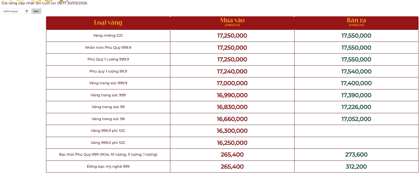 Cập nhật bảng giá vàng ngày 20/3 tại một số công ty vàng bạc đá quý trong nước.