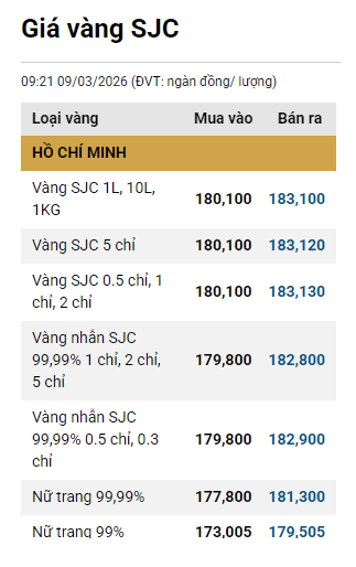Tại Việt Nam, vào đầu giờ sáng 9/3, giá vàng miếng SJC được Công ty Vàng bạc đá quý Sài Gòn niêm yết ở mức 182 - 185,02 triệu đồng/lượng (mua vào - bán ra).