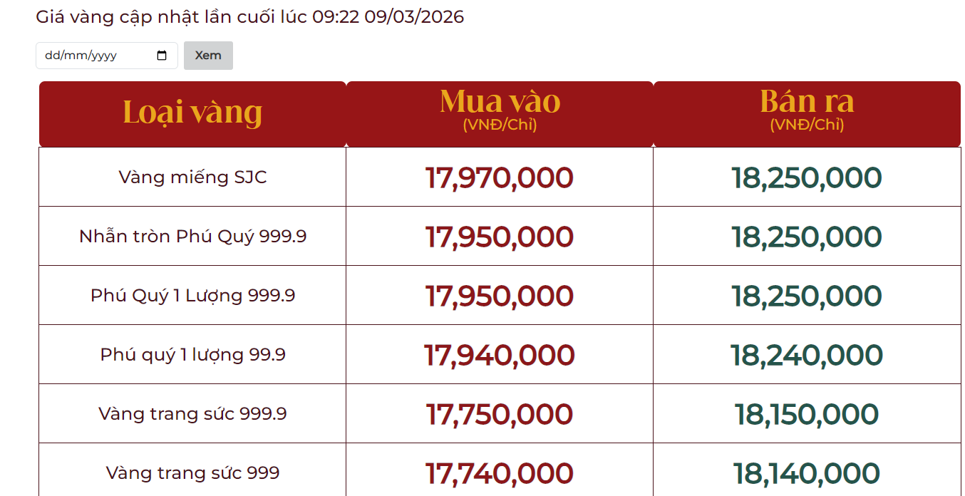 Dưới đây là bảng giá vàng tại một số công ty vàng bạc đá quý trong nước sáng 9/3: