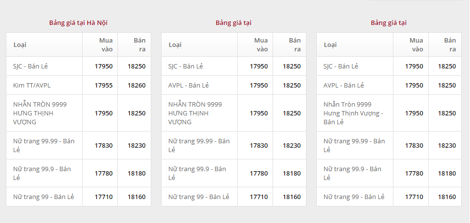 Giá vàng tại Công ty TNHH MTV Vàng bạc đá quý Sài Gòn (SJC):