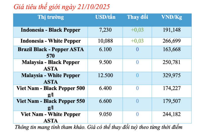 Cập nhật giá tiêu thế giới từ Hiệp hội Hồ tiêu Quốc tế (IPC) lúc 4 giờ 30 phút sáng 21/10/2025, thị trường hồ tiêu xuất khẩu hôm nay ghi nhận sự biến động nhẹ tại thị trường Indonesia. Các thị trường khác ổn định so với hôm qua.