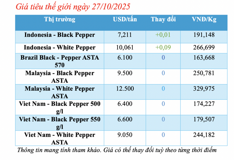 Cập nhật giá tiêu thế giới từ Hiệp hội Hồ tiêu Quốc tế (IPC) lúc 4 giờ 30 phút sáng 27/10/2025, thị trường hồ tiêu xuất khẩu hôm nay ghi nhận biến động nhẹ tại thị rường Indonesia. Các thị trường đều ổn định giá so với hôm qua.