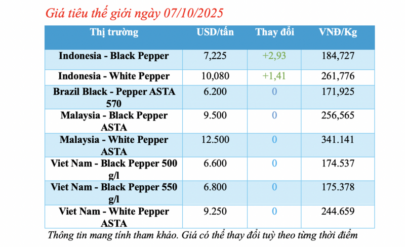 Cập nhật giá tiêu thế giới từ Hiệp hội Hồ tiêu Quốc tế (IPC) lúc 4 giờ 30 phút sáng 7/10/2025, thị trường hồ tiêu xuất khẩu hôm nay ghi nhận sự biến động mạnh mẽ tại thị trường Indonesia.