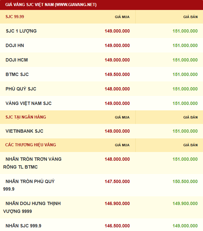 Giá vàng miếng được Công ty TNHH MTV Vàng bạc đá quý Sài Gòn - SJC, Bảo Tín Minh Châu, PNJ và Tập đoàn DOJI cùng niêm yết giá vàng ở mức 148,5 - 150,5 triệu đồng/lượng (mua vào - bán ra), mức giá giảm 500.000 đồng/lượng ở cả hai chiều mua - bán so với hôm qua.