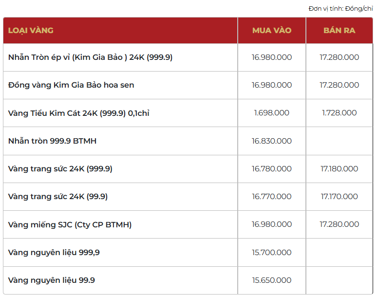 Bảo Tín Mạnh Hải niêm yết giá nhẫn tròn ép vỉ Kim Gia Bảo ở mức 169,8 - 172,8 triệu đồng/lượng (mua vào - bán ra), tăng 1,2 triệu đồng/lượng cả hai chiều mua vào và bán ra so với chốt phiên giao dịch trước.