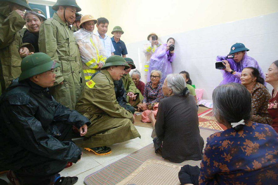 Phó Thủ tướng Trần Hồng Hà thăm hỏi, động viên người dân điểm sơ tán dân cư tránh bão số 5 tại trường tiểu học Đan Trường, xã Đan Hải, Hà Tĩnh